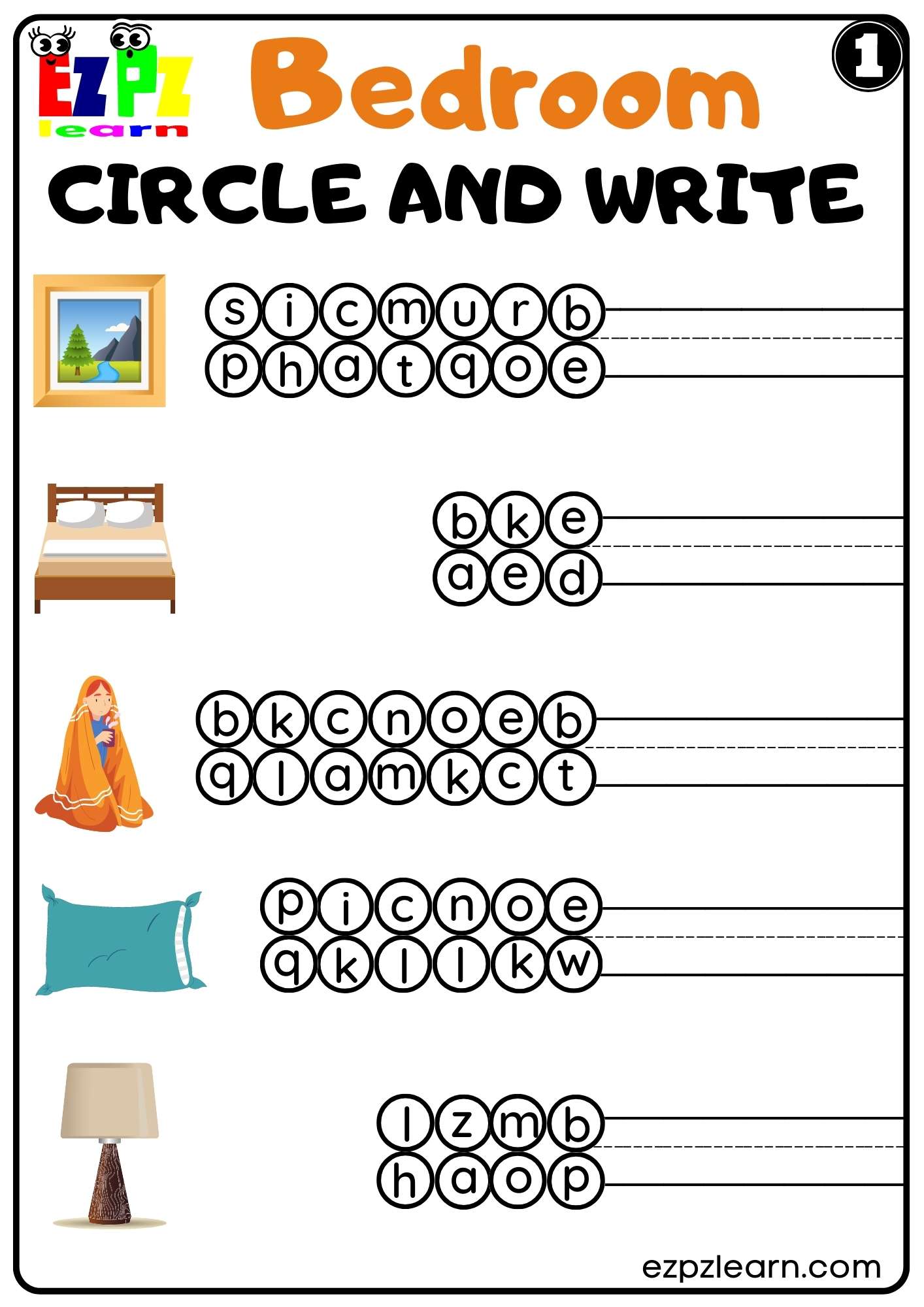 Bedroom Circle and Write Worksheet for ESL Students and Homeschool Free PDF Download set 1