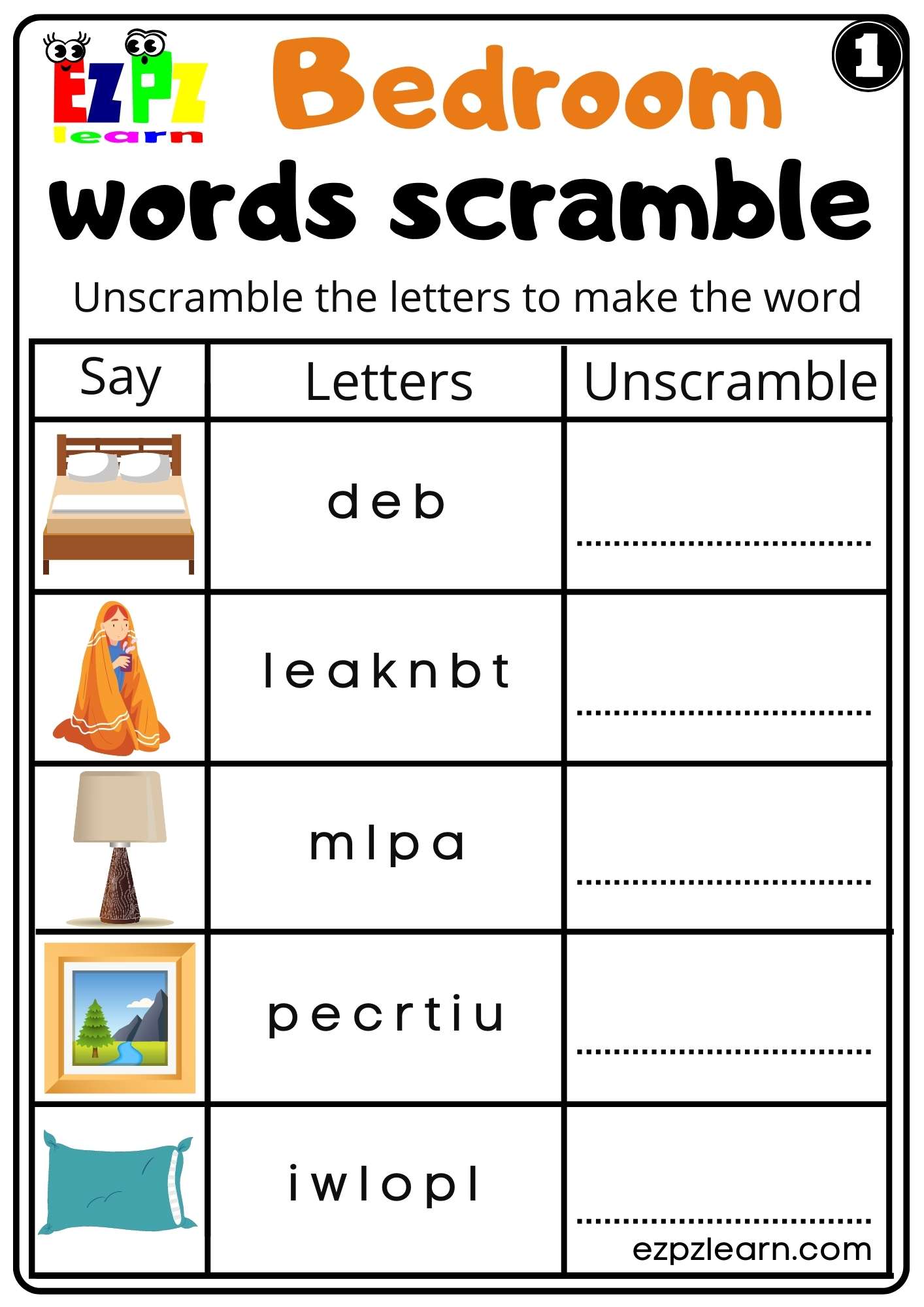 Bedroom Word Scramble Worksheet for ESL Students and Homeschool Free PDF Download set 1