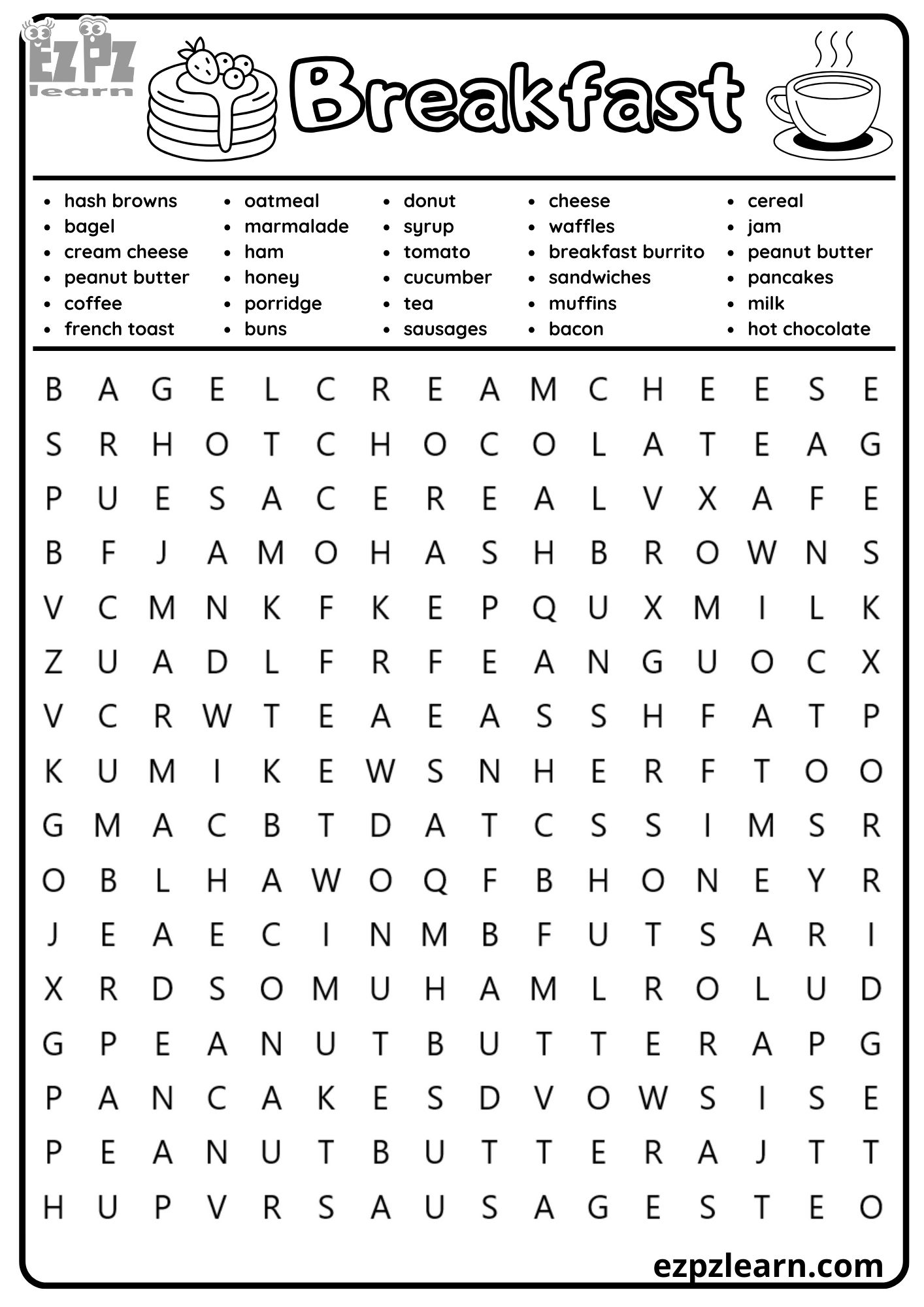 Breakfast Food Vocabulary Word Search for Kids, Adults and ESL Students Free Printable PDF Download 30 words