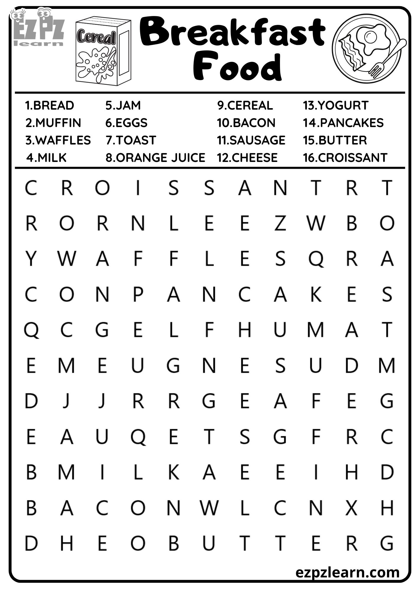Breakfast Food Vocabulary Word Search for Kids, Adults and ESL Students Free Printable PDF Download