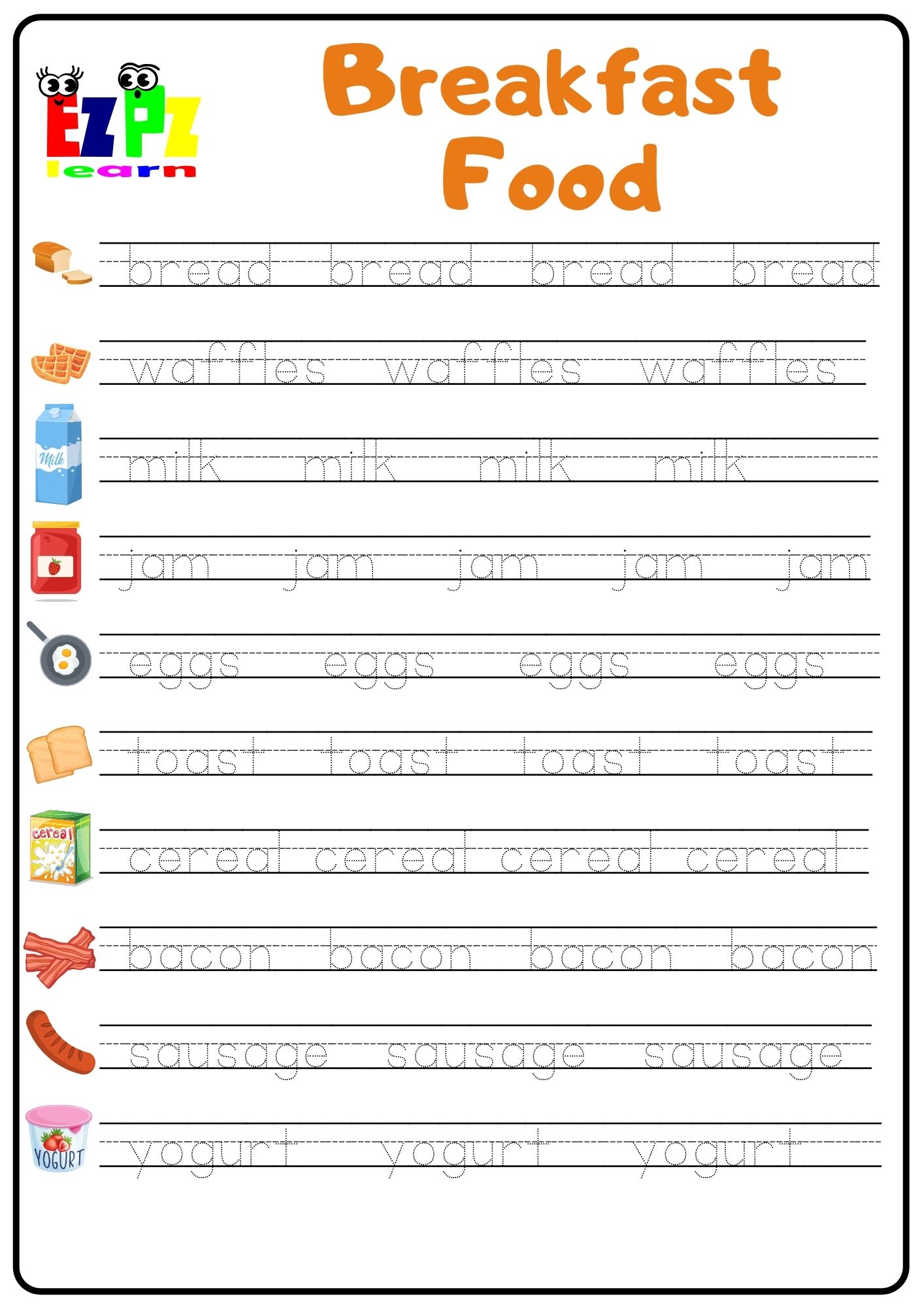 Breakfast Food Word Tracing Worksheet