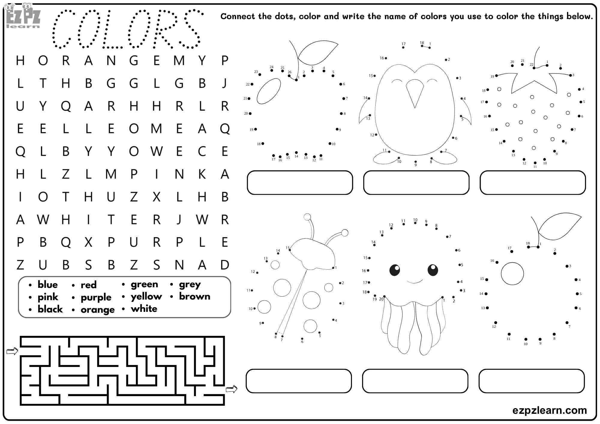 Clothes Vocabulary for Kids. Includes: Word Search, Dot to Dot, Coloring, and Maze Activities.