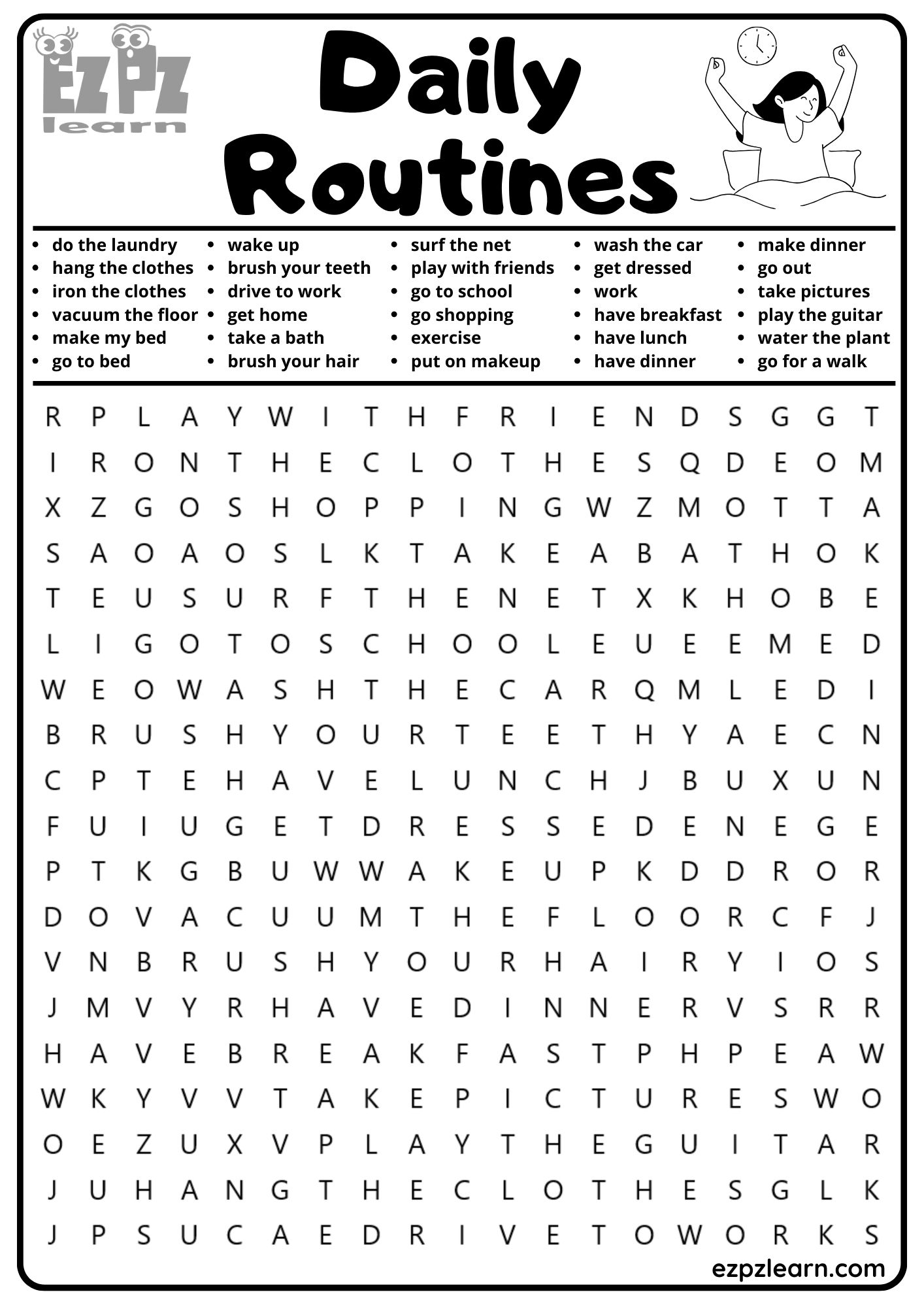 Daily Routines Vocabulary Word Search for Kids and English Language Learners 30 Words Downloadable PDF