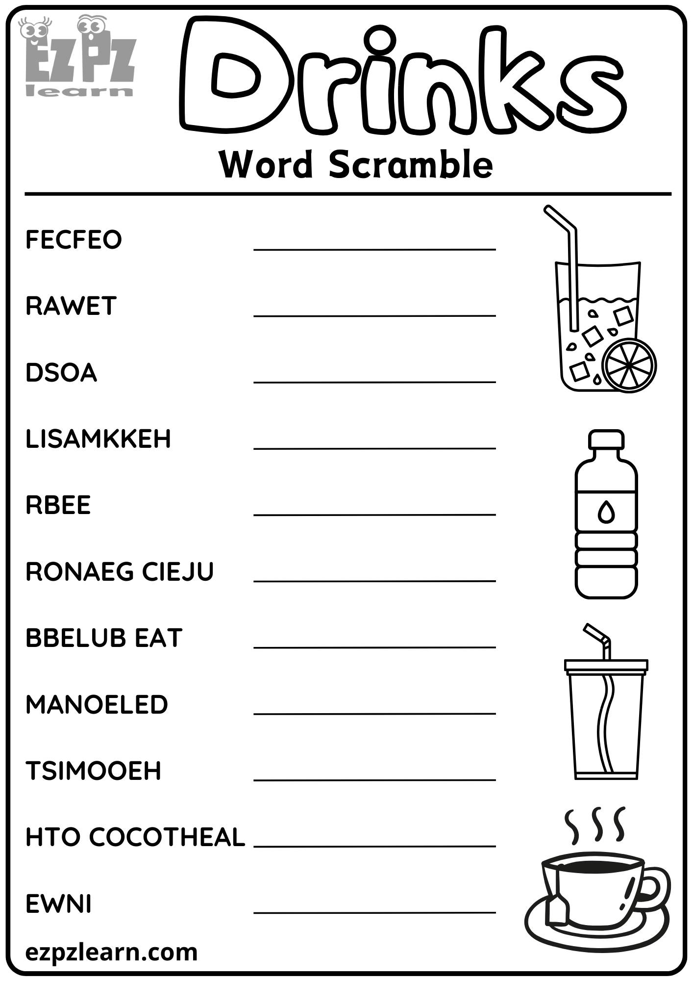 Drinks Word Scramble 11 Vocabulary Words Free Download PDF File