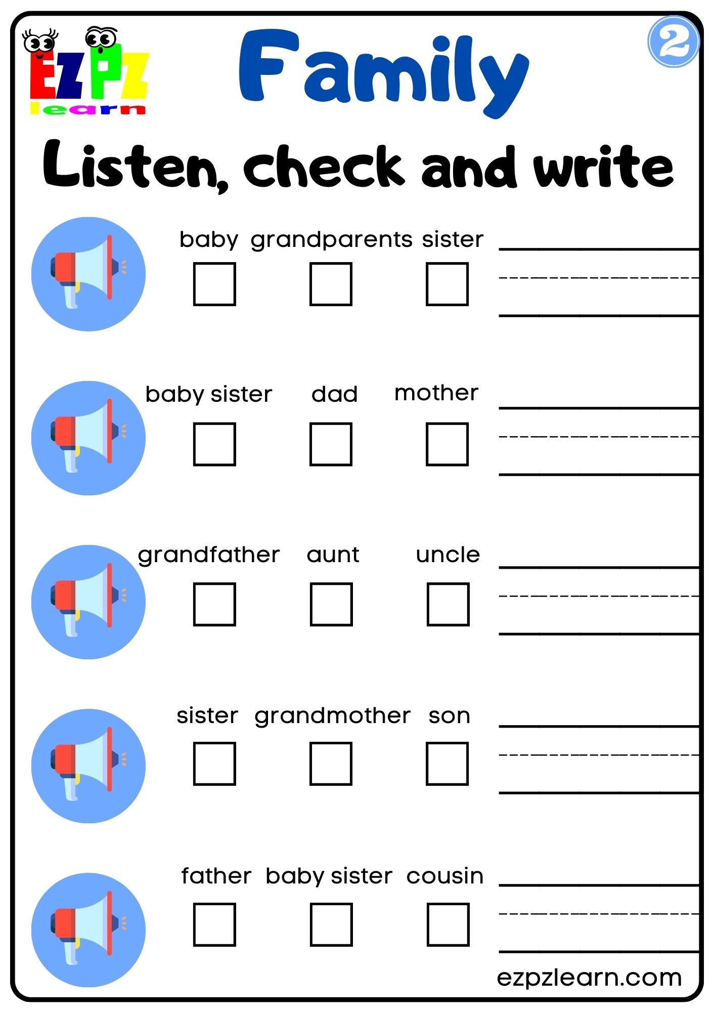Family Vocabulary Interactive Worksheet Listen, Check and Write the Words Activity for K3 G2