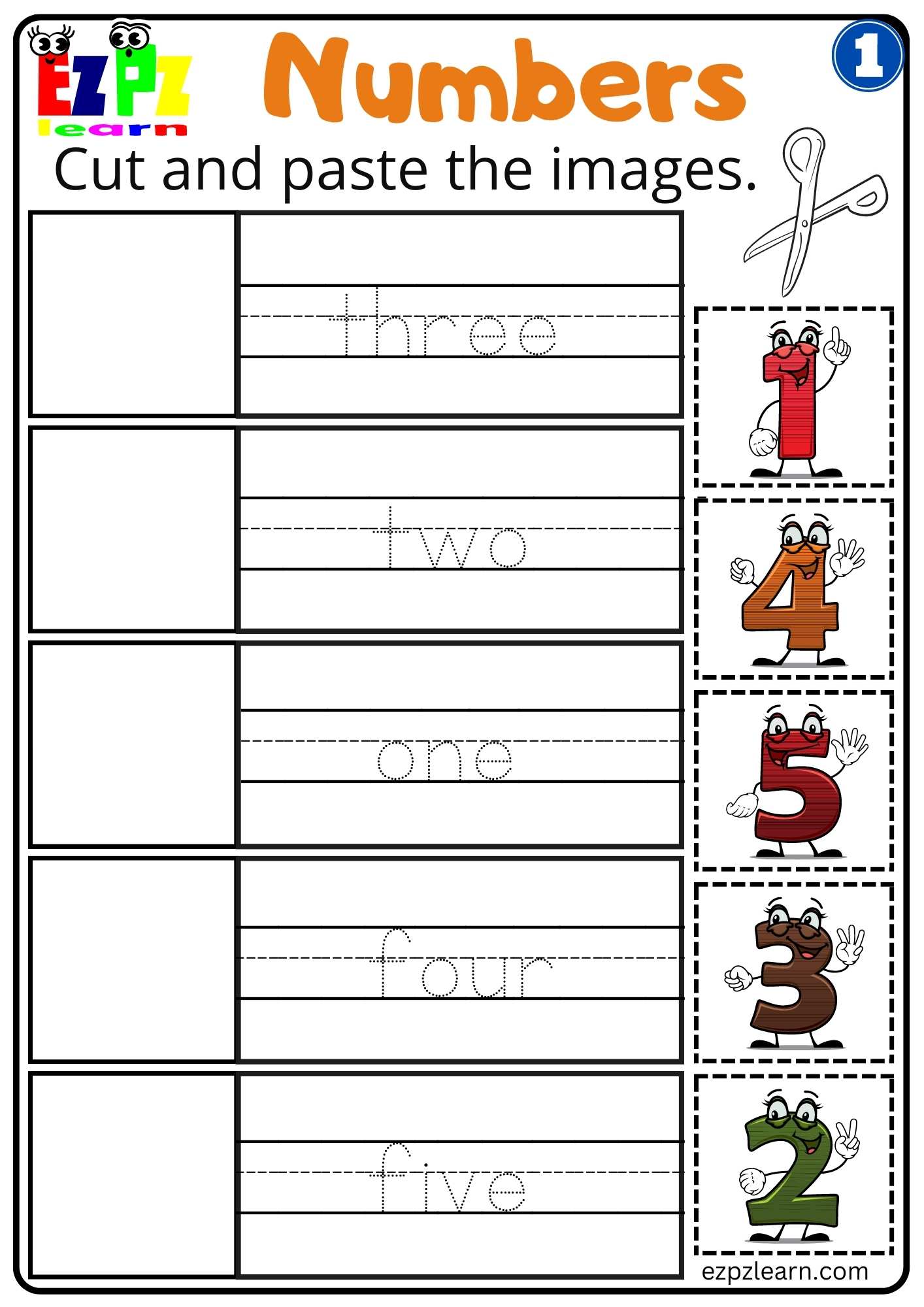 G1 Numbers Cut and Paste Worksheet for Kindergarten K5 and ESL Students Free Download
