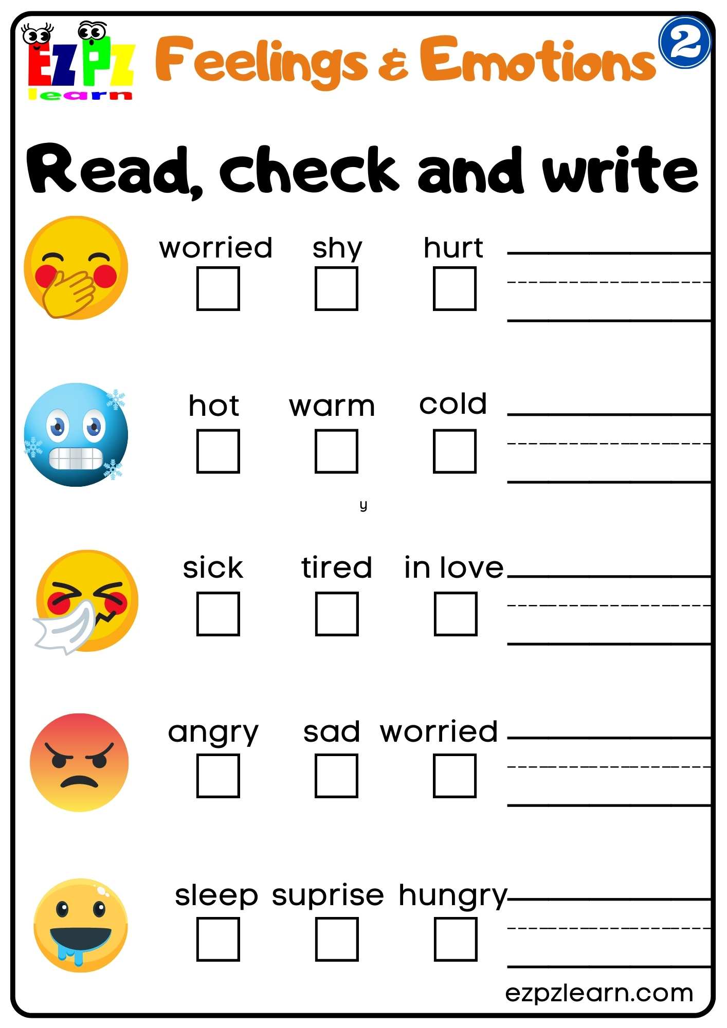 Group 2 Feelings and Emotions Read Check and Write Worksheet for Children and ESL Students Free PDF Download
