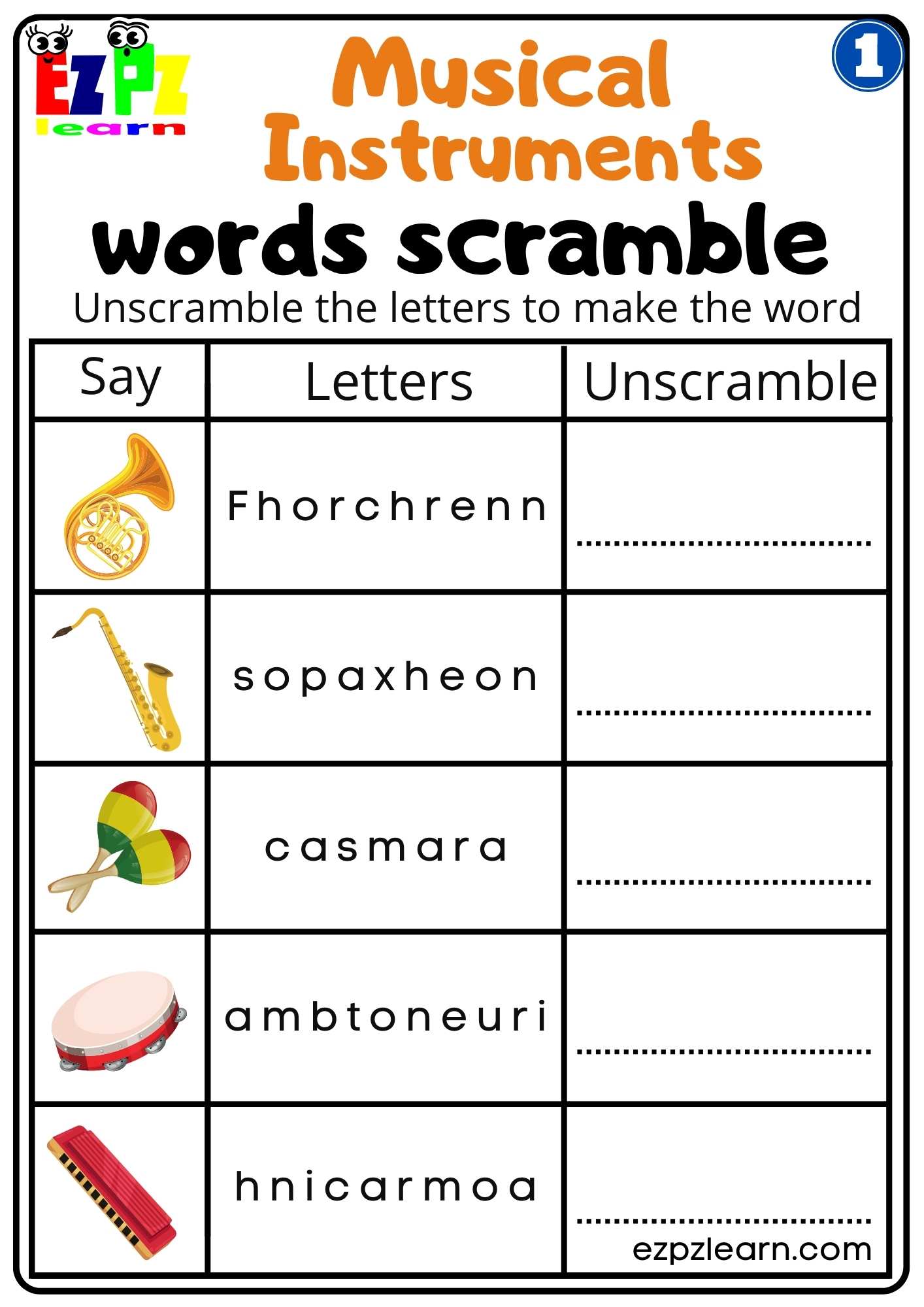 Group One Musical Instruments Words Scramble Worksheet Free PDF Download
