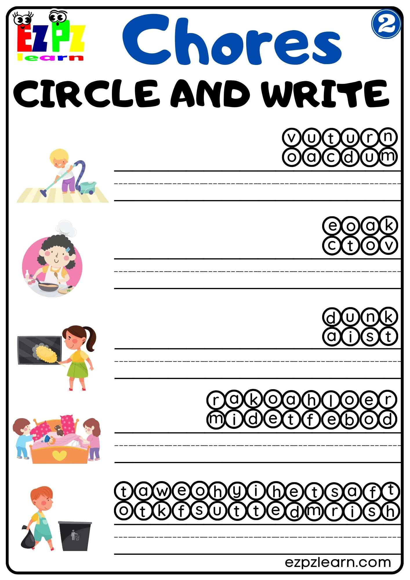 Household Chores Vocabulary Circle and Write Worksheet For Children and ESL Students Download Free Group 2
