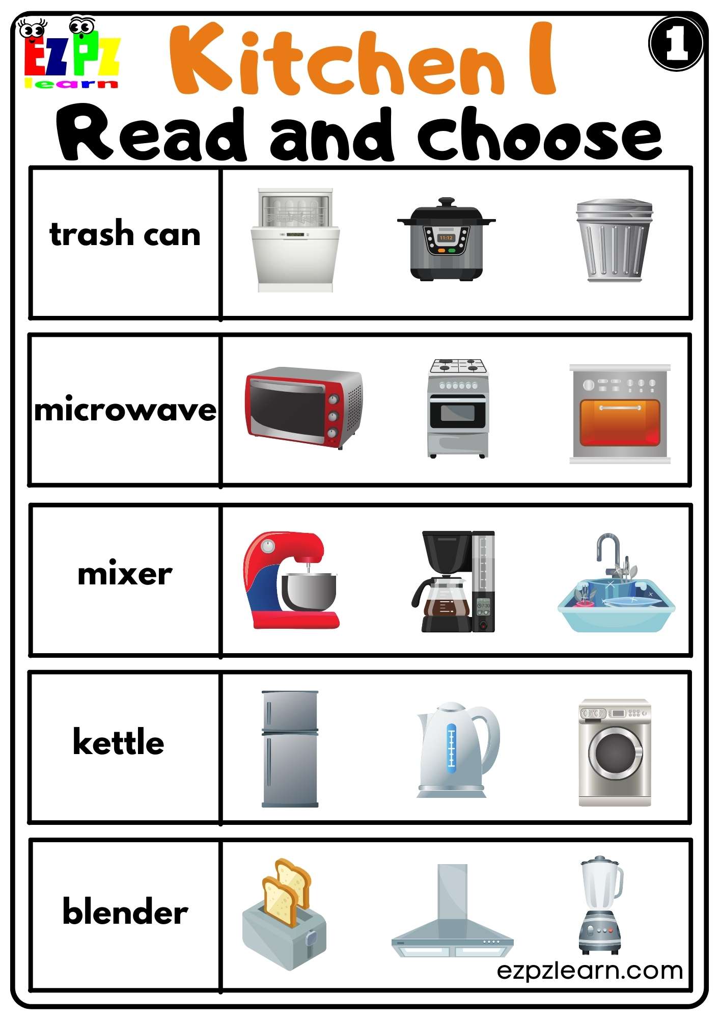 Kitchen Appliances Read and Choose Worksheet for ESL Free PDF Download Set 1