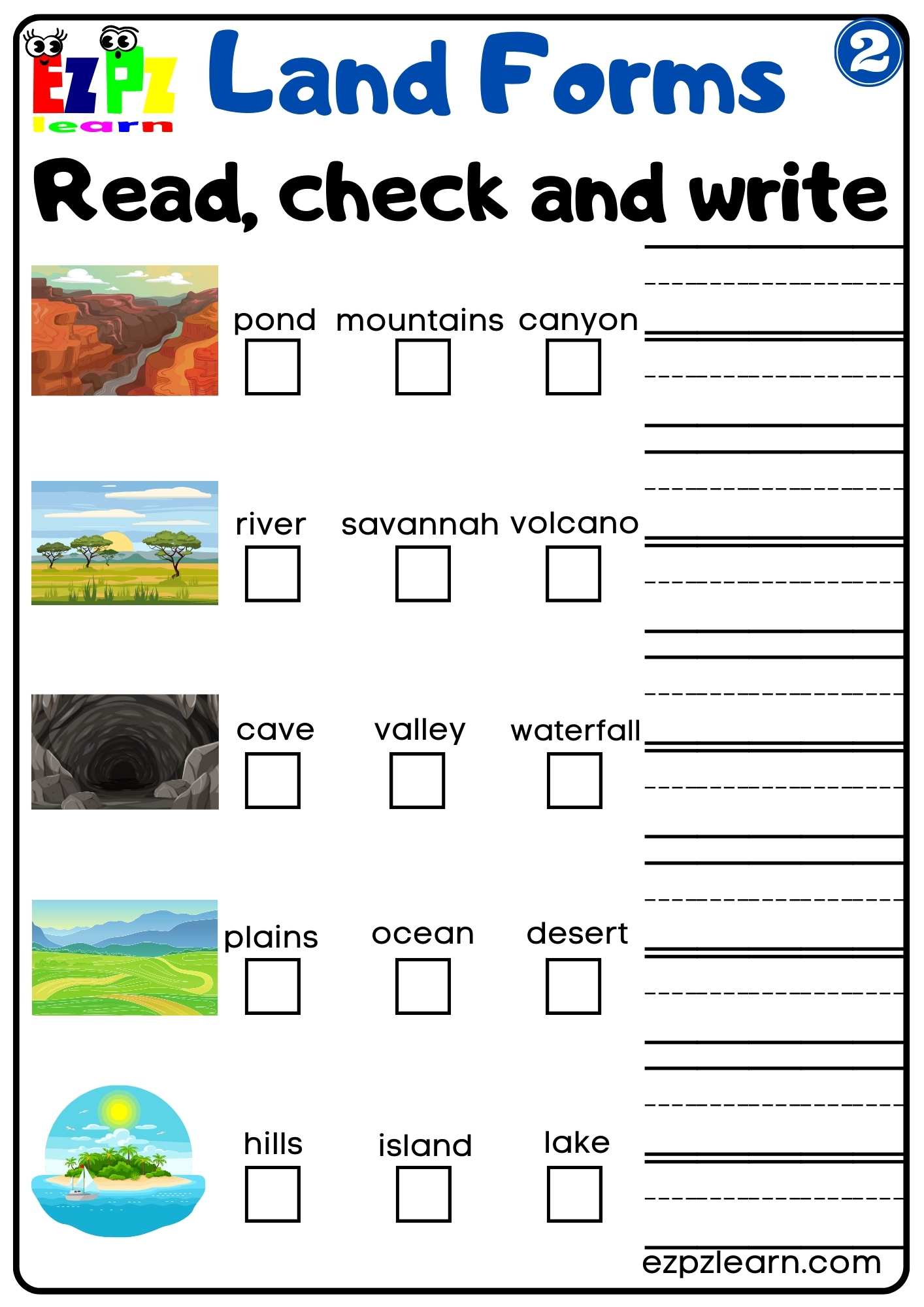 Land and Water Forms Read Check and Write Activity Free PDF download set 2