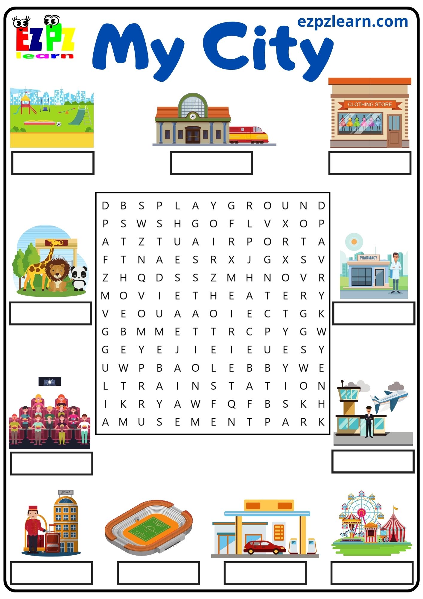 My City Places Vocabulary Word Search and Write the Words Activity for Kids and English Language Learners PDF