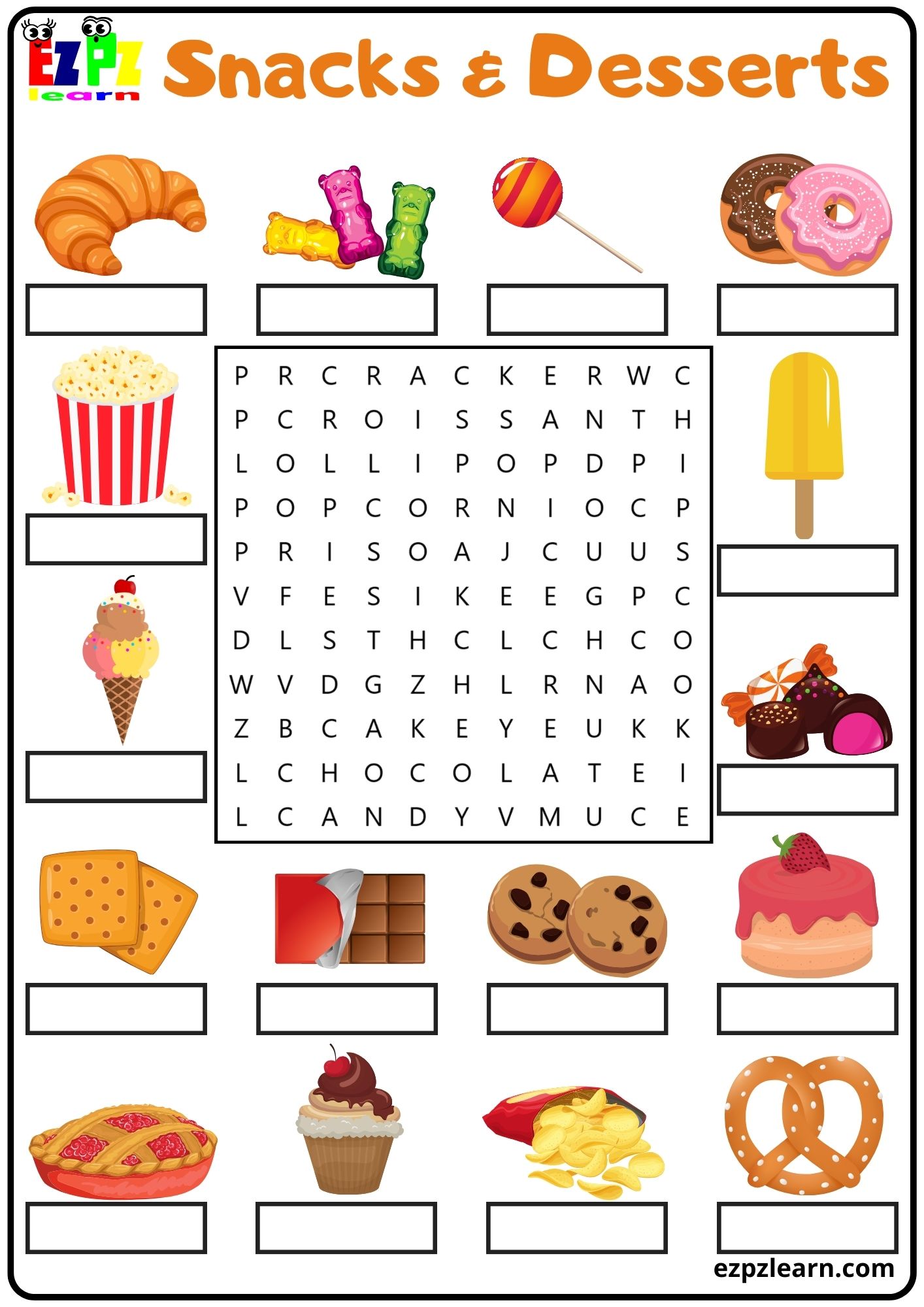 Snacks and Desserts Vocabulary Word Search and Write the Words Activity for Children and English Language Learners PDF