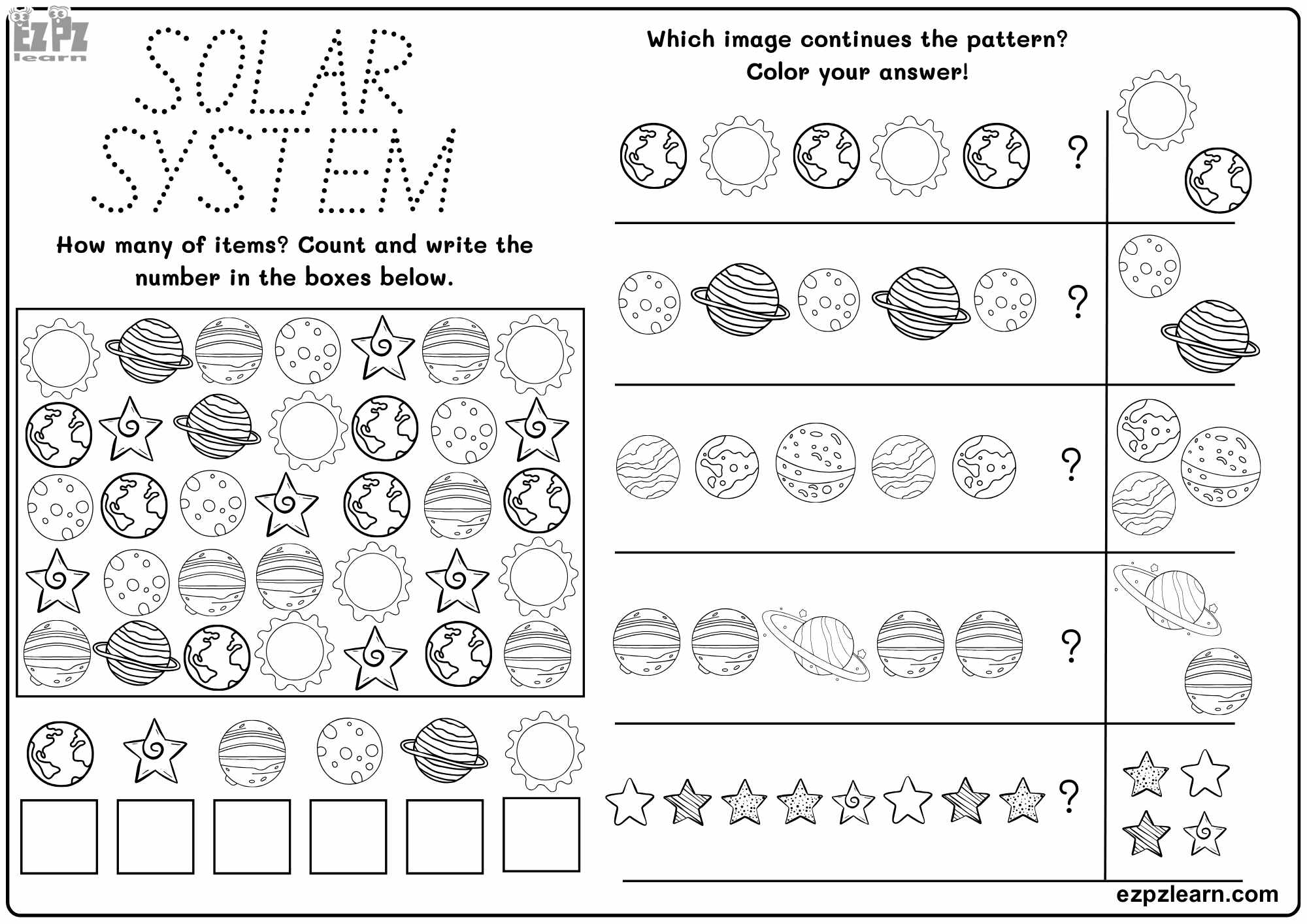 Solar System Vocabulary. I spy find, count and color. Complete the pattern activity for kids. Free PDF download.