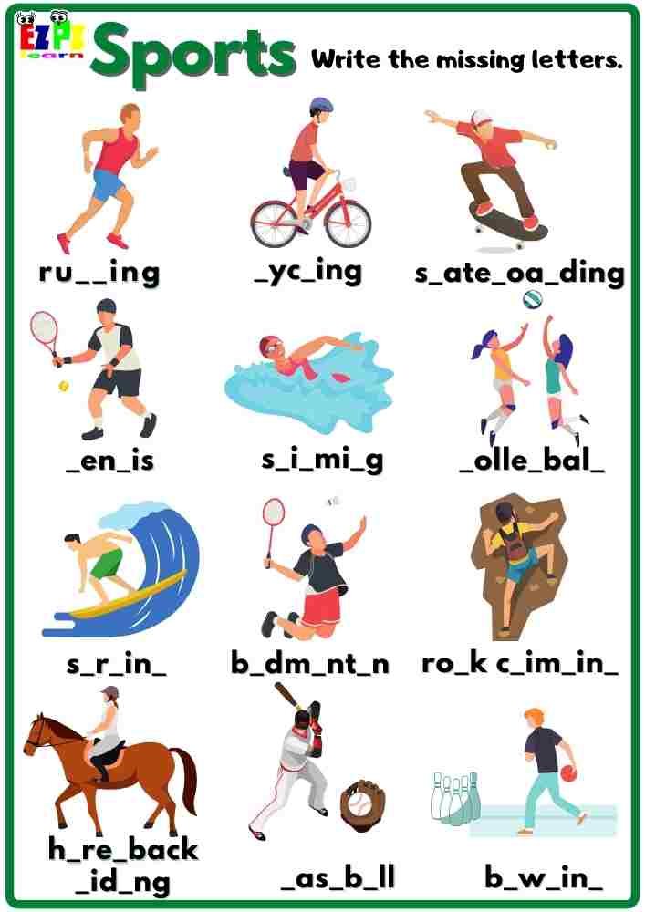 Sports Vocabulary Set 1 Write the Missing Letters Worksheet