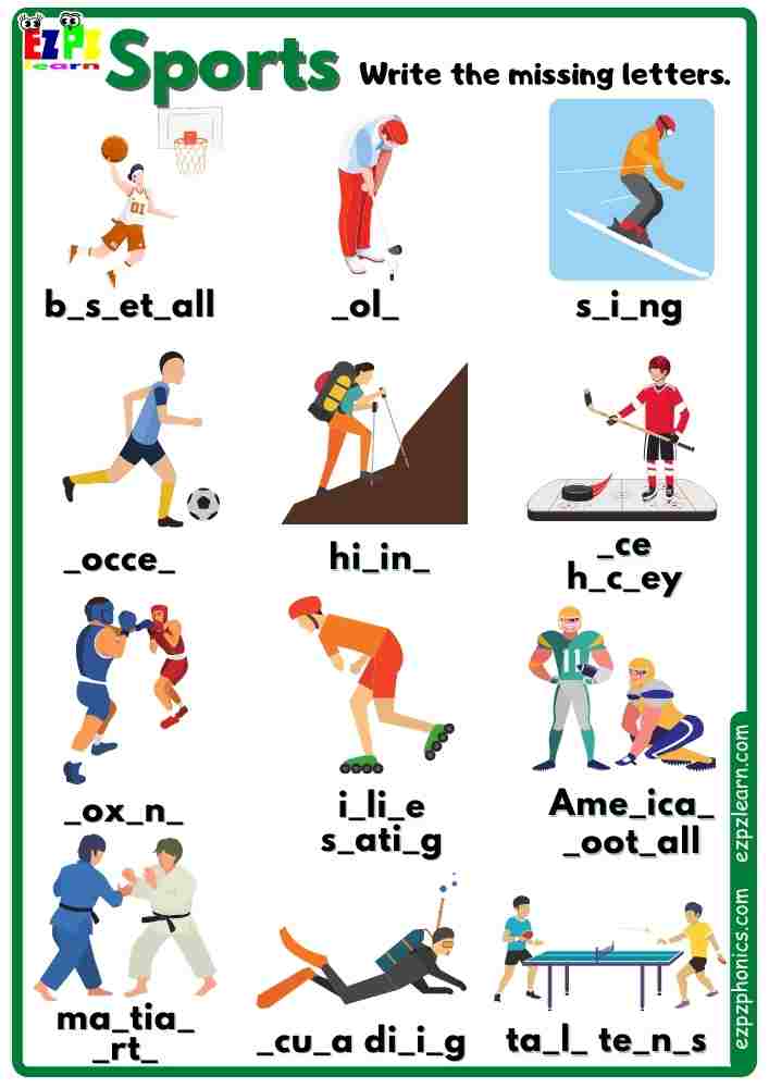 Sports Vocabulary Set 2 Write the Missing Letters Worksheet