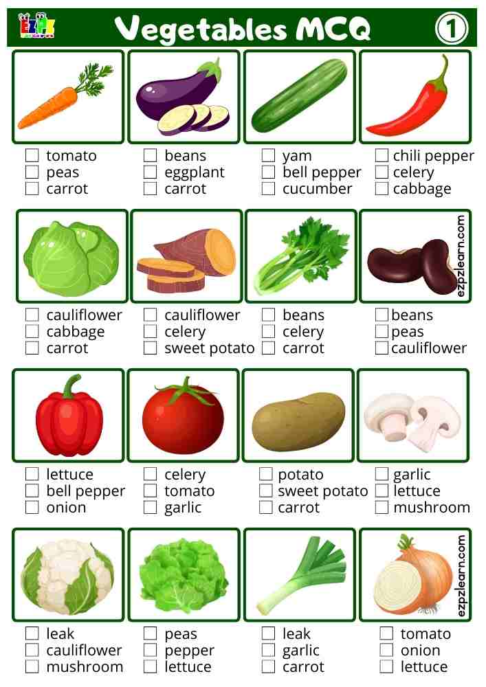Vegetables Multiple Choice Questions (MCQ) Worksheet – Free PDF Download is a fun and interactive way to help preschool, kindergarten, and ESL learners practice vegetable vocabulary in English. This worksheet challenges children to look at a picture of a vegetable and choose the correct word from multiple options.