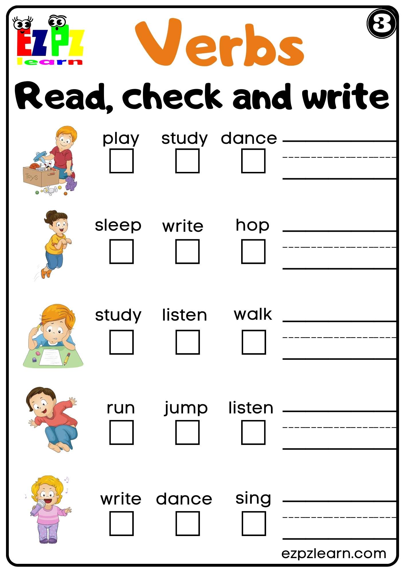 Verbs Read Check and Write Easy Worksheet for K5 and ESL Students PDF Download Set 3