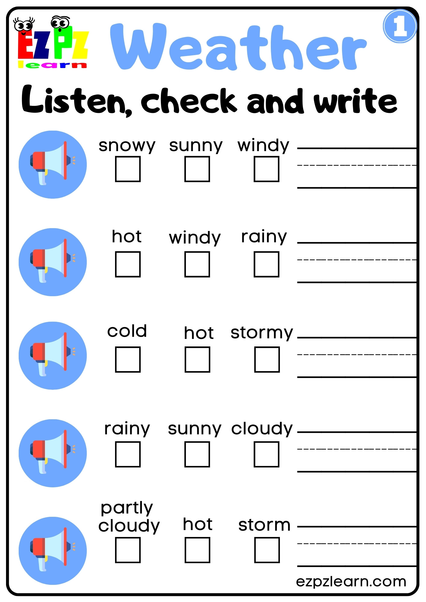 Weather Vocabulary Interactive Worksheet Listen, Check and Write the Words Activity for Kindergarten and ESL Students G1