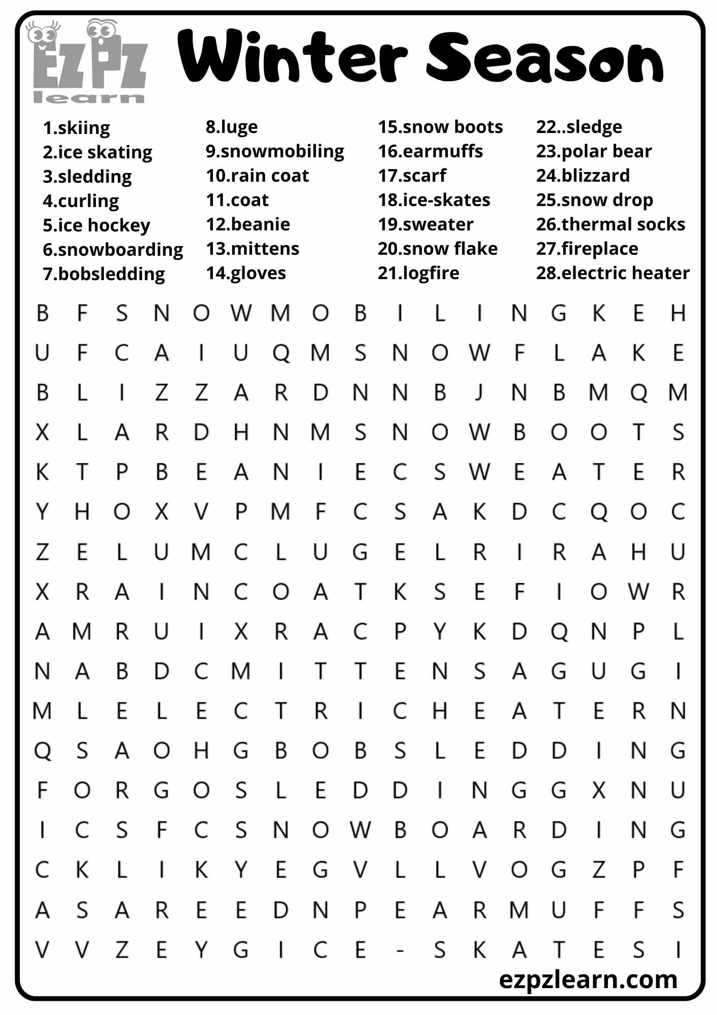 Winter Season Vocabulary 28 Words Search Activity for Kids and English Language Learners PDF Download