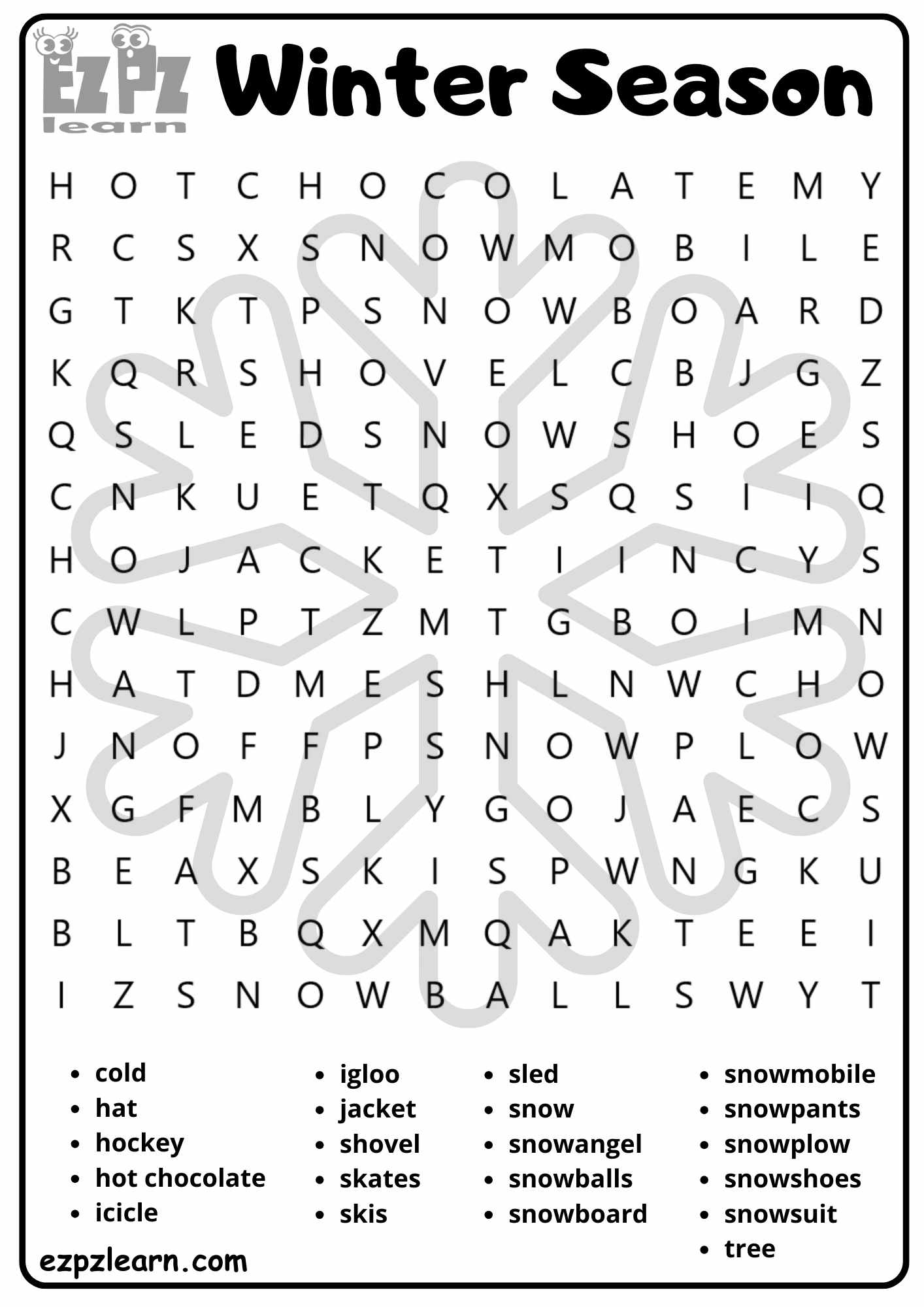 Winter Season Vocabulary Word Search Activity for Kids and English Language Learners PDF Download