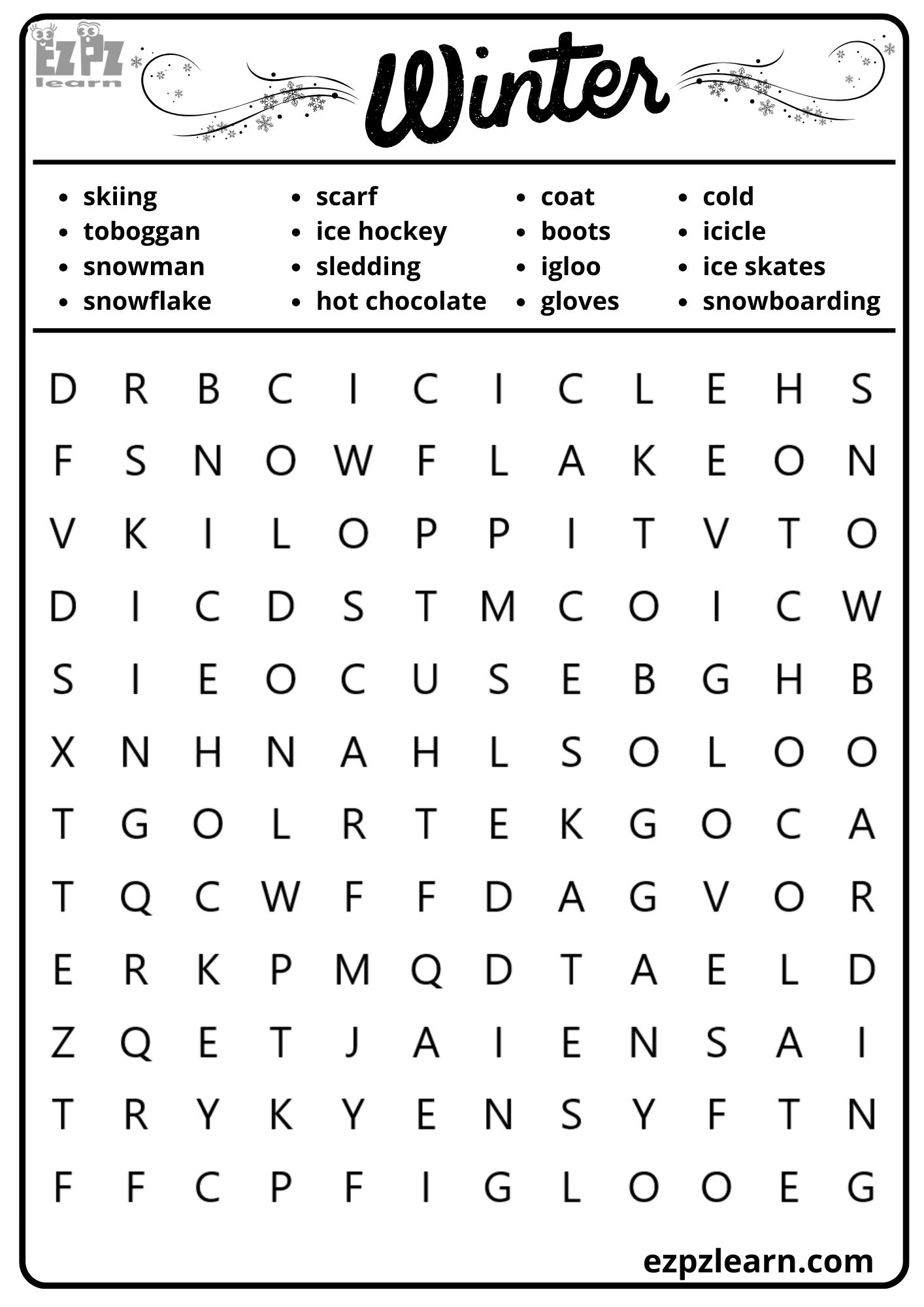 Winter Season Vocabulary Word Search for Kids and English Language Learners 16 Words Downloadable PDF