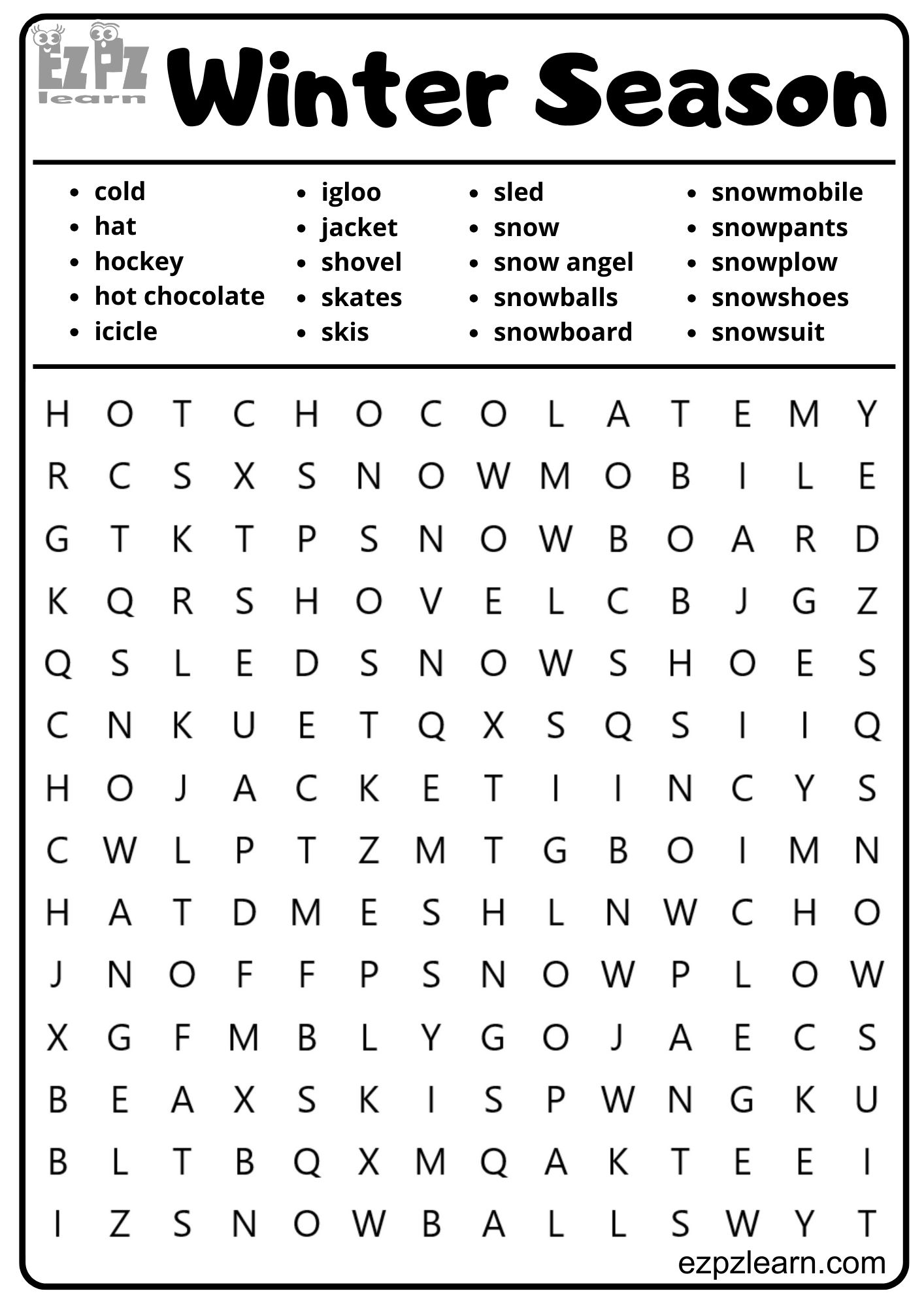 Winter Season Vocabulary Word Search for Kids and English Language Learners 20 Words Free Downloadable PDF